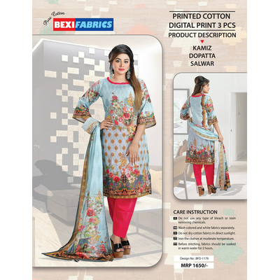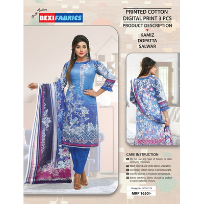 Denim Blue Bexi Digital Printed Cotton Three Piece - জিন্সের নীল কালার বেক্সি ডিজিটাল প্রিন্ট কটন থ্রিপিস