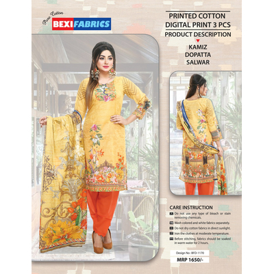 Mustard Yellow Bexi Digital Printed Cotton Three Piece - মাস্টার হলুদ কালার বেক্সি ডিজিটাল প্রিন্ট কটন থ্রিপিস