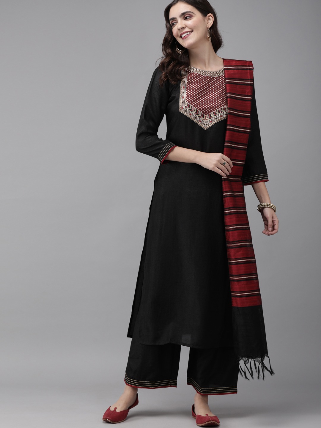 Black & Maroon Yoke Design Kurta with Palazzos & Dupatta
